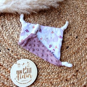 Ce doudou, composé d’une face imprimée et d’une face en minky tout doux pour les petites joues, saura réconforter bébé.